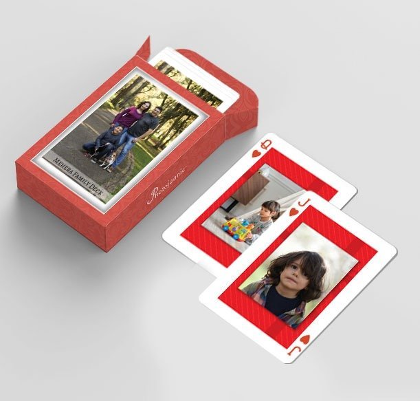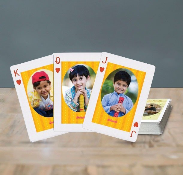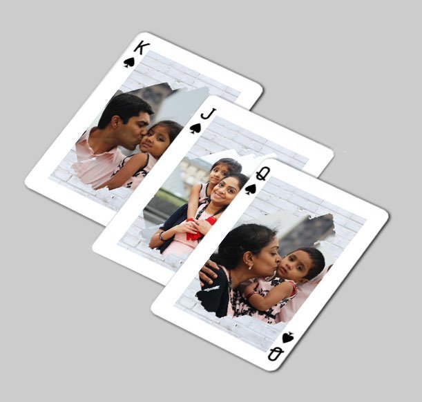 Get your photo on a deck of custom playing cards India. Personalize the king, queen and jack of every suite with your own photos. Custom playing cards can feature a wide range of designs and styles, including unique illustrations, photos, logos, or text. They can be made of high-quality paper materials.